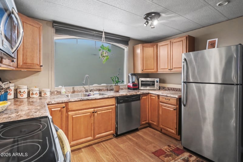 Listing details for 730 Country Club Dr #56, Mesa, AZ 85210 : Welcome to effortless living in this beautifully updated Mesa manufactured home. Designed to keep your bills low, it features dual-pane windows, a newer AC, and fresh insulation throughout for year-round efficiency. The modern kitchen shines with natural light and stylish finishes, creating a warm, inviting heart of the home. Relax in the enclosed Arizona room—your private retreat complete with a hot tub for year-round enjoyment. Nestled in a quiet community just minutes from the highway, shopping, dining, and everyday essentials. Comfort, convenience, and value come together here—priced competitively and ready to impress.