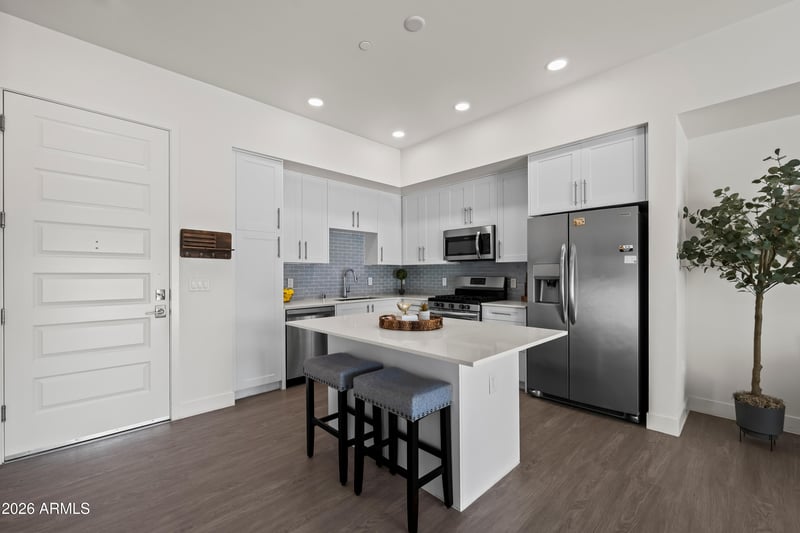 Listing details for 7300 Earll Dr #1022, Scottsdale, AZ 85251 : Bright and airy first-floor residence with 10-foot ceilings and the rare benefit of no shared walls. This 1 bed, 1.5 bath condo features a sleek modern kitchen with quartz countertops, stainless appliances, subway tile backsplash, and an oversized island. The open layout flows to a private patio, ideal for quiet mornings or evening relaxation. Spacious primary suite with ensuite bath and generous closet space. Inspire is a gated community offering assigned underground parking, a pool & spa, fitness center, stylish lounge, BBQ area, and a brand-new dog park. All just minutes from Old Town Scottsdale dining, shopping, and nightlife.