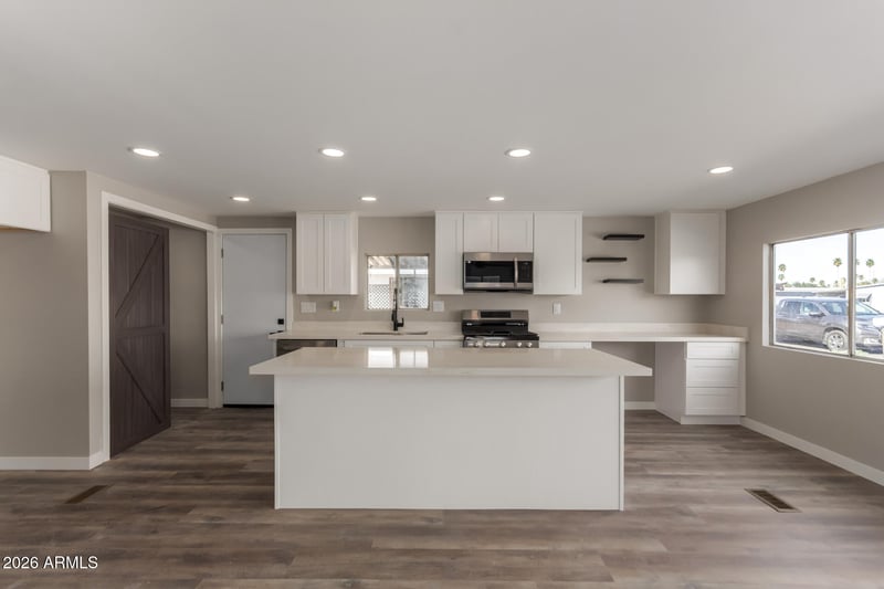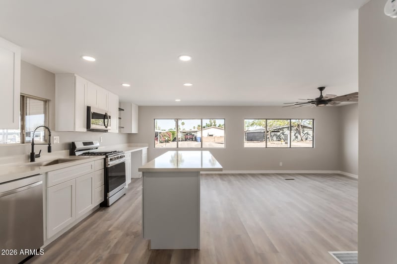 Listing details for 7337 Jan Ave, Mesa, AZ 85209 : Beautifully remodeled 2 bedroom manufactured home in Desert Sands Golf & Country Club with no HOA and no age restrictions. The home has been freshly painted inside and out and features all new flooring, fixtures and lighting throughout. With a great room floor plan and an open, updated kitchen offering a large island, quartz countertops and brand new appliances. Both bathrooms have been remodeled with walk-in showers, new countertops and refreshed cabinets. Major improvements include all new PEX plumbing, new hot water heater, new windows, newly coated roof and a newer A/C unit. Outside, enjoy low maintenance yards, a 2-car tandem carport, and a convenient storage shed offering a move-in-ready home in a desirable golf course community without added fees or restrictions.