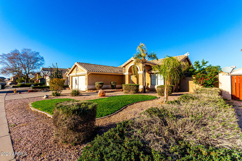 Listing details for 7344 Medina Ave, Mesa, AZ 85209 : Charming single-level home with a great location close to schools, freeways, and golfing! The manicured landscape & 2-car garage are just the beginning. Inside, you'll find vaulted ceilings, wood-look flooring, plenty of natural light, and earthy colors, all set in an inviting open layout perfect for entertaining & relaxation. The pristine kitchen is equipped with track lights, oak cabinetry, tile backsplash, granite countertops, built-in appliances, and an island with a breakfast bar, ideal for casual meals. The serene main bedroom promises a good night's sleep and boasts a practical walk-in closet and a bathroom with dual sinks. Enjoy outdoor living in the backyard, including a covered patio, well-laid pavers, and a grass area perfect for games. Hurry up, this gem won't last!