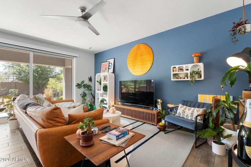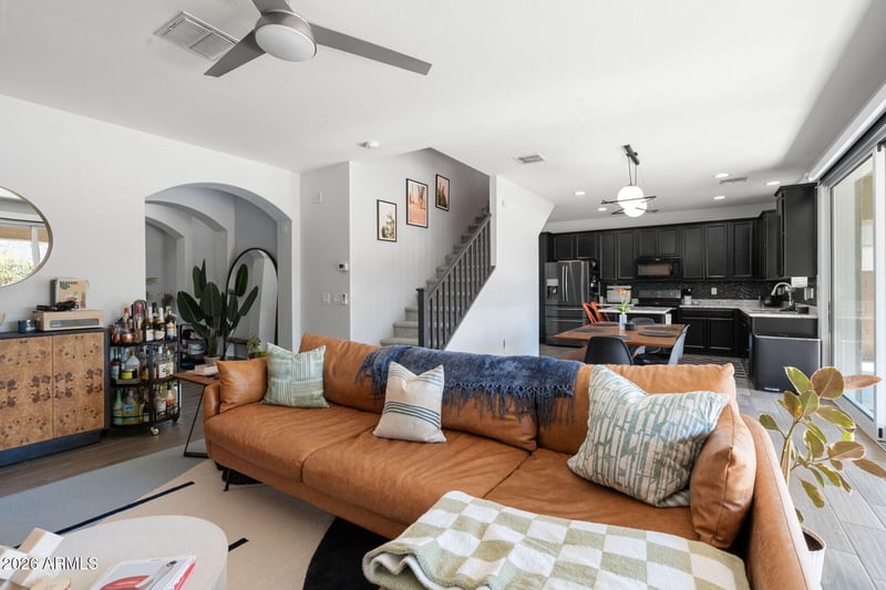 Listing details for 735 Gary Ln, Phoenix, AZ 85042 : Beautiful home with no neighbors behind! A welcoming front porch sets the tone for what's inside. A spacious foyer flows seamlessly into open common areas with abundant natural light, neutral paint, and stylish wood-look tile flooring. The kitchen features breakfast bar island, granite counters, built-in appliances, mosaic backsplash, and dark cabinetry. Upstairs, a delightful loft provides flexible space for a media room or play area. The primary suite has a well-appointed bathroom showcasing dual vanities, a soaking tub, and a glass-enclosed shower. Adorable backyard offers a full-length covered patio, lush green grass, a charming pond, and serene mountain views--plus no neighbors behind. Located in a gated community with access to a pool, playground, and scenic walking trails. Must see!