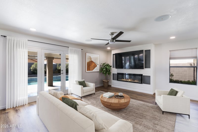 Listing details for 7383 Utopia Rd, Glendale, AZ 85308 : Freshly updated and back on the market in highly sought-after Arrowhead Ranch! This stunning 4-bedroom, 2.5-bath home with dedicated office combines elegant design with thoughtful upgrades throughout. Soaring ceilings and an inviting layout create the perfect setting for both everyday living and effortless entertaining. Recent improvements include luxury vinyl flooring throughout, upgraded baseboards, and stylish new lighting, bringing a fresh, modern feel to the home. At the heart of the home is the reimagined chef's kitchen, featuring a THOR gas cooktop with pot filler, custom cabinetry, designer backsplash, wall ovens, and an extended island with food-grade sealed butcher block, farm sink, and generous prep space--a dream for cooking and gathering. The grand entry opens to spaciou formal living and dining areas, highlighted by a custom built-in wine display beneath the staircase, adding both charm and sophistication. Upstairs, the luxurious primary suite offers a spacious sitting area with cozy fireplace--your own private retreat. The spa-inspired primary bath exudes comfort and elegance, while the secondary bedrooms are generously sized and connected by a Jack-and-Jill bath with dual sinks and a beautiful travertine shower. Step outside to a true backyard oasis, where the fully remodeled pool features new PebbleTec, pop-up cleaning system, new drain, and a relaxing lounge deck perfect for enjoying Arizona's sunshine. A rare opportunity to own a beautifully updated home in one of the Valley's most desirable communities.