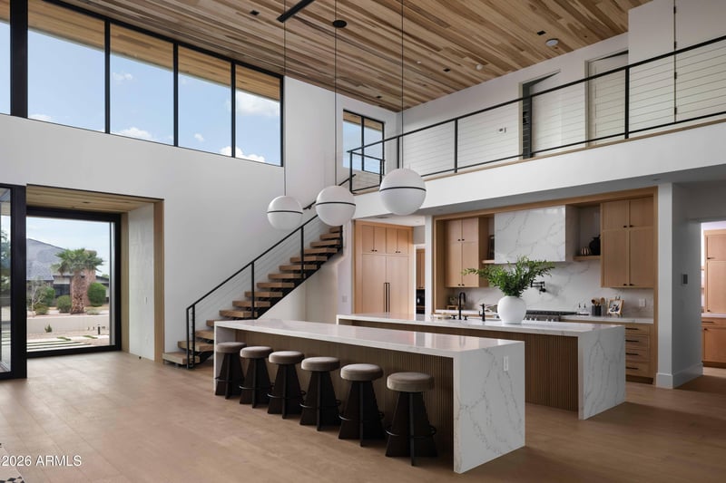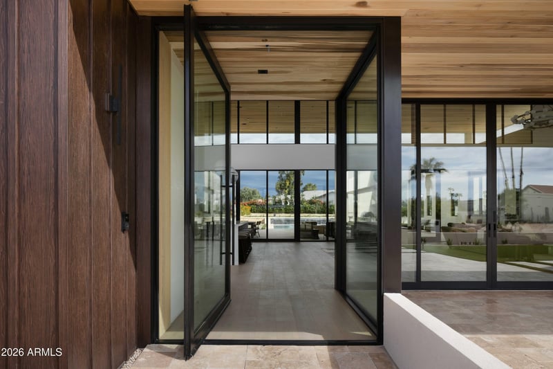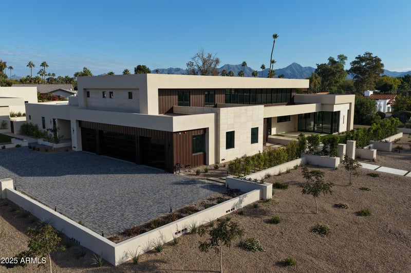 Listing details for 7432 Wethersfield Rd, Scottsdale, AZ 85260 : Brand-new 9,000 SF modern estate on 1.1 acres with a standout 7-car garage setup, built for the buyer who actually uses their space. The main residence is paired with a detached guest house featuring its own 3-car garage and private gated entry, creating a true secondary residence for visitors, multi-generational living, or a driver, staff, or security arrangement. Inside, a thoughtful split floor plan centers on an expansive great room, defined by 24-foot ceilings and walls of glass that open to the resort-style backyard. The chef's kitchen is anchored by a hidden prep kitchen for clean entertaining. The primary suite sits in its own private wing, and a nearby flex space with French doors and a full bath, separated by a striking wine wall, works perfectly a lounge, office, or gym. Every bedroom offers an en-suite bath for privacy and function. Outside, enjoy a pool, outdoor kitchen and bar, and a full sports court, all designed to match the home's seamless indoor-outdoor flow. Modern architecture, high-end finishes, and move-in ready completion make this one of Scottsdale's rare new-build luxury opportunities, with garage capacity that sets it apart.