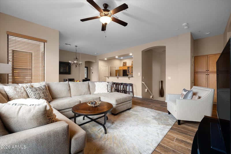Listing details for 7445 Eagle Crest Dr #1116, Mesa, AZ 85207 : TURNKEY, lock & leave Cachet at Las Sendas villa, light, bright & move‑in ready. Just bring your clothes & clubs! 2 bed/2 bath upstairs end‑unit offers private interior stairs & wood‑look flooring thru-out. Open floor plan includes a breakfast bar, dining area & great Room with patio access. Split layout features a primary suite w/dual sinks, shower & walk‑in closet, while the guest suite has its own private patio. Newer HVAC, dishwasher & fridge. Cachet residents enjoy an exclusive pool, spa, gym & clubhouse. HOA covers exterior maintenance, roof, paint, landscaping & insurance. Las Sendas offers pools, tennis, pickleball, parks, trails & splash pad. Many clubs & activities are available . Walk to the Las Sendas Golf Course Patio Grill for sunsets, food and music. Enjoy the lifestyle that comes with living in Cachet at Las Sendas. This turnkey villa offers effortless access to some of the most scenic outdoor destinations in the East Valley, including the trails of Tonto National Forest, Usery Mountain Regional Park, and Saguaro Lake, all ideal for hiking, cycling, boating, and year-round desert exploration.