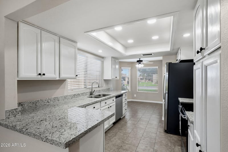 Listing details for 747 Arrowwood Way, Mesa, AZ 85208 : NEW REMODELED KITCHEN! Welcome to effortless luxury living! All you need to bring are your clothes, golf clubs, and toothbrushâthe rest is ready for you. The kitchen boasts sleek tile flooring, smooth ceilings, new LED recessed lighting, and wired ceiling fans for year-round comfort. Elegant laminate wood floors flow throughout, while the new HVAC system (installed Spring 2022) ensures modern efficiency.