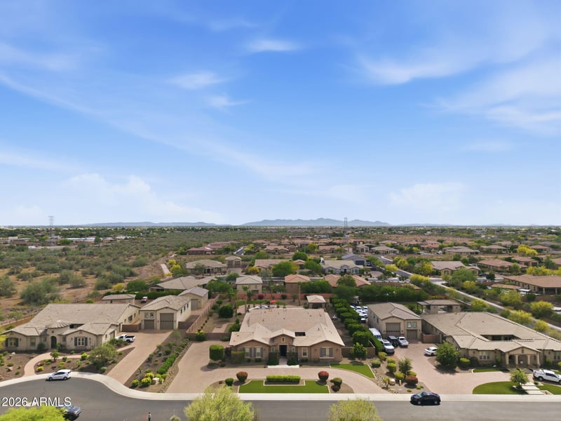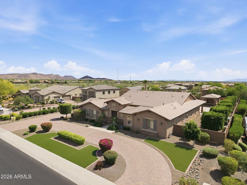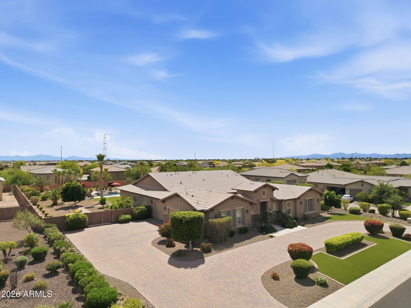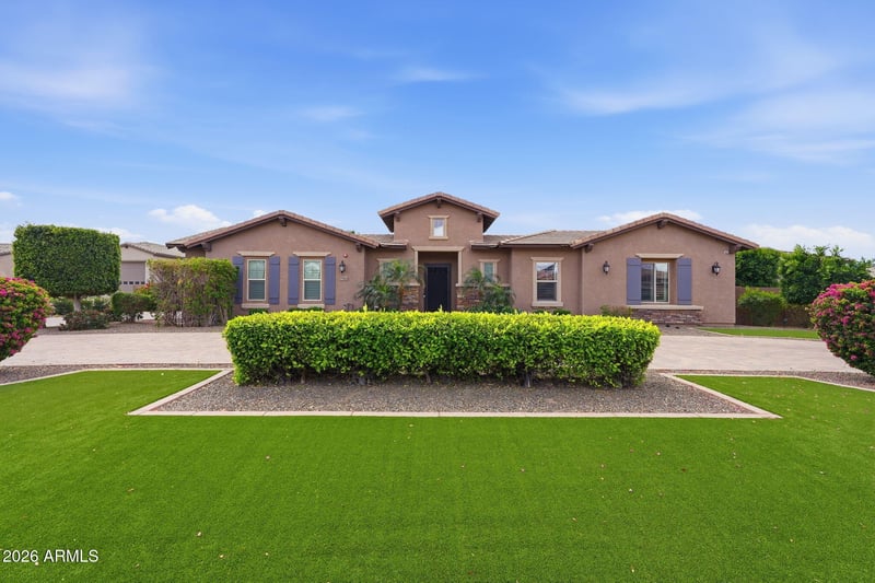 Listing details for 7561 Artemisa Ave, Peoria, AZ 85383 : Beautiful single-story home located in a gated community on an expansive almost one-acre lot, featuring an attached casita, private courtyard entry, and circular paver driveway. This well-maintained home features an open floor plan with a large chef's kitchen offering granite countertops, extensive cabinetry, center island with sink, stainless steel refrigerator, tile backsplash, built-in microwave, and single wall oven, plus a long serving counter/butler's pantry area perfect for entertaining. The home includes both formal dining and casual dining areas and opens to spacious living areas with crown molding, plantation shutters, and ceiling fans throughout. The oversized primary suite features large windows with backyard views and plenty of space for a sitting area. Secondary bedrooms are generously sized, and there is additional flex space perfect for an office. Exterior features include a gated front courtyard entrance, stone exterior accents, grass landscaping, RV gate and side yard access, large paver circular driveway, and a 3-car garage. The backyard offers a resort-style setting with a heated pool and raised spa with spillover water feature, large paver patio, ramada, and mature landscaping, ideal for outdoor entertaining. The attached 352 square foot casita with private entrance is perfect for guests or a home office.