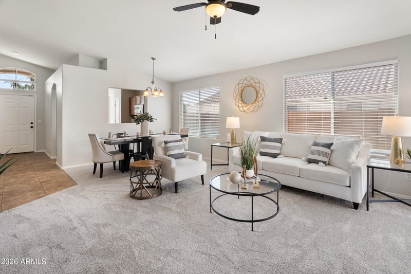 Listing details for 7570 Nicolet Ave, Glendale, AZ 85303 : Step inside this beautifully refreshed Glendale home, ideally located just minutes from the vibrant Westgate Entertainment District. From the moment you enter, you'll appreciate the tall ceilings and open, airy layout that fills the space with natural light. The large living and dining areas flow effortlessly together, creating an inviting setting for both entertaining guests and everyday living. The kitchen features brand-new stainless steel appliances, fresh paint, new carpet, and a cozy eat-in nook—perfect for casual mornings or family dinners. The primary suite is a true retreat with a relaxing garden tub, separate shower, and an oversized walk-in closet offering plenty of storage. Two additional bedrooms provide flexibility for guests, a home office, or a hobby space. The primary retreat features a large walk-in closet and a well-appointed ensuite bath with a separate soaking tub and walk-in shower. Enjoy unparalleled convenience with close proximity to the ever-expanding Westgate district, home to premier dining, shopping, entertainment, State Farm Stadium, and easy freeway access. Don't miss this opportunity to own a beautifully updated home in one of Glendale's most vibrant and convenient locations.