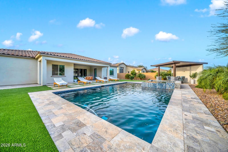 Listing details for 7626 Monte Lindo --, Peoria, AZ 85383 : NO ELECTRIC BILL + SELLER PAYS OFF SOLAR WITH FULL-PRICE OFFER Skip the electric bill and step into luxury at 7626 W Monte Lindo - a 2022-built, highly upgraded home designed for modern living, entertaining, and multigenerational flexibility. With monthly APS credits from the solar system, you get energy efficiency without an added payment. Inside, you'll find soaring 12-foot ceilings, designer finishes, and a bright open-concept layout centered around a chef's kitchen with an oversized island, walk-in pantry, and seamless flow into the living and dining spaces. Massive sliding glass doors open to the covered patio and pergola, creating the perfect indoor/outdoor lifestyle Arizona buyers love. The flexible floor plan offers 4 bedrooms, 3.5 bathrooms, a private office, and a bonus room. A standout feature is the Next Gen suite, ideal for guests or multigenerational living, complete with its own living space, bathroom, washer/dryer hookups, and the option to add a kitchenette. Unwind in the spacious primary suite featuring dual walk-in closets and a spa-inspired bath with separate vanities, a soaking tub, and rainfall shower. Brand-new carpet in all bedrooms pairs beautifully with tile flooring throughout the main living areas. Outside, enjoy a true resort-style backyard with no rear neighbors, a heated pool and spa, turf, pavers, and a custom putting green - plus extra side yard space ready for your personal touch. Additional highlights include a 3-car tandem garage, RV gate, EV charger, tankless water heater, and water softener. This move-in-ready home combines luxury, efficiency, and flexible space in one exceptional package. Schedule your private showing today and experience it in person.