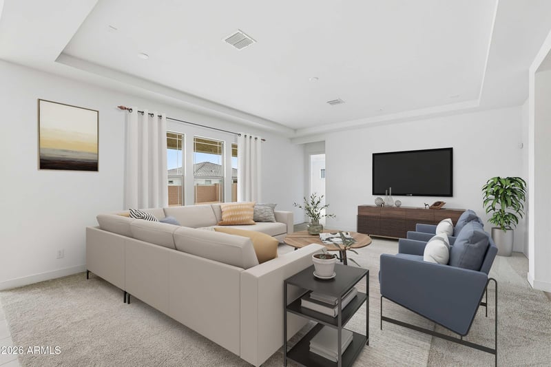 Listing details for 7643 Hide Trl, Peoria, AZ 85383 : What's Special: Mountain View | Dedicated Home Office | 3-Car Garage. New Construction - Ready Now! Built by America's Most Trusted Home Builder. Welcome to the Catalina at 7643 W Hide Trail in Aloravita South Summit! Bright single-level home with an open great room, stylish kitchen, covered patio, private suite, teen room, study, and a serene primary retreat with walk-in closet. Additional Highlights Include: Gourmet kitchen with 36'' gas cooktop, crown molding at kitchen cabinets, security system prewire, square corner with 5'' baseboards, white cabinets, upgraded quartz countertops, double gate, garage service door, showers at secondary baths, custom wall tile in bathrooms, and gas line for outdoor kitchen. Virtually staged photos are for representative purposes only. MLS# 6986186