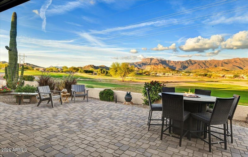 Listing details for 7674 Whispering Mesquite Ln, Gold Canyon, AZ 85118 : Wake up to iconic, unobstructed views of the Superstition Mountains and the rolling fairways of Mountainbrook Golf Courseâ€''a truly rare backdrop that defines Arizona desert luxury. From sunrise to sunset, the scenery is nothing short of spectacular. Ideal for out-of-state or second-home buyers, OR, year round! This residence offers a low-maintenance, lock-and-leave lifestyle with thoughtful upgrades and modern conveniences throughout. Furnishings may be negotiated separately or included with an accepted offer, making this an exceptional opportunity for a move-in-ready or turnkey retreat, contingent upon the seller securing a furnished replacement property. Extensively updated with over $75K in improvements, this home features, new kitchen appliances, new exterior paint, a new washer and dryer, custom stonework and pavers throughout the courtyard, driveway, side yard, and back patio. Remote-controlled smart blinds provide effortless light and privacy control, AND SO MUCH MORE! (See Documents tab for full list of upgrades.) Designed for comfort and entertaining, the thoughtfully designed layout offers two spacious master suites, vaulted ceilings, and expansive windows framing stunning desert and mountain views. Timeless finishes include granite countertops and plantation shutters throughout. Embrace Arizona's outdoor lifestyle with a private tiled courtyard, covered patio with new power shade, and an air-conditioned garage with a dedicated workshop. Additional features include a central vacuum system, soft water system, and reverse osmosis for year-round comfort and peace of mind, even when you're away. Located in Mountainbrook Village, a premier golf course community at the base of the Superstition Mountains, residents enjoy resort-style amenities, an active social calendar, and a relaxed desert setting, ideal for seasonal living, winter retreats, or full-time enjoyment. Easy to show.
