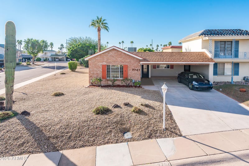 Listing details for 7727 Bonita Dr, Scottsdale, AZ 85250 : Brand new engineered wood flooring was installed on April 15, 2026. It looks absolutely gorgeous! Welcome to this updated property located in the highly sought-after retirement community (55+ age requirement) and historic destination of Villa Monterey. This beautiful home is situated on a desirable corner lot with a larger-than-average size and features a side gate for added convenience. The property boasts a bright, airy open floor plan, thanks to numerous windows, French doors, skylights, and recessed lighting, all complemented by neutral paint colors. It includes two bedrooms, two bathrooms, a separate living room, a family room, a formal dining area, and a covered parking area that accommodates two vehicles. Recent improvements include a newly installed roof (living room) the remaining part of the roof was recoated, a five-ton gas package air-conditioning unit, and high-efficiency LG gas appliances, including a stove, water heater, and stackable washer and dryer. Both bathrooms have also been freshly updated, including sewer/plumbing lines, and the outdoor sewer line has been replaced. The kitchen features an island with space for bar stools, quartz countertops, and a reverse-osmosis system. You'll find a combination of carpet and engineered wood flooring, custom baseboards, and ceiling fans. The kitchen refrigerator, washer, dryer, and both attached TVs are included in the sale. The front and backyards are easy to maintain, featuring a desert landscape adorned with many rose bushes. Don't miss the beautiful custom iron front door. Expansion potential as the HOA/City approved plans to extend the east and north walls for a larger enclosed backyard. Additionally, the property is conveniently located across the street from the private community pool. Situated in a desirable Scottsdale location, this home is near Old Town Scottsdale, spring training baseball, Scottsdale Fashion Mall, ASU, freeways, parks, golf courses, bike paths, restaurants, and Talking Stick Casino.