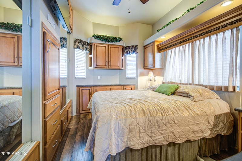 Listing details for 7750 Broadway Rd #425, Mesa, AZ 85208 : This is a beautiful home with a deck and a view of the mountains. It is right next to the walk way that leads to the clubhouse in Carriage Manor Resort, a premier 55+ Community where you OWN THE LAND! Outside you have 4 drawers for extra storage and a block wall on 3 sides of the property. It has a large front kitchen with a moveable island and full size appliances including a dishwasher. The bedroom has a queen bed but you could easily fit a king size bed in this large bedroom. In the large Arizona room you'll find an additional bathroom with a stand up shower and a full size stackable washer and dryer. This home comes completely furnished and is ready to be moved into. Carriage Manor has 24/7 on site security, a heated saltwater pool/spa, fitness facility, Tennis, Pickle ball, Golf Club