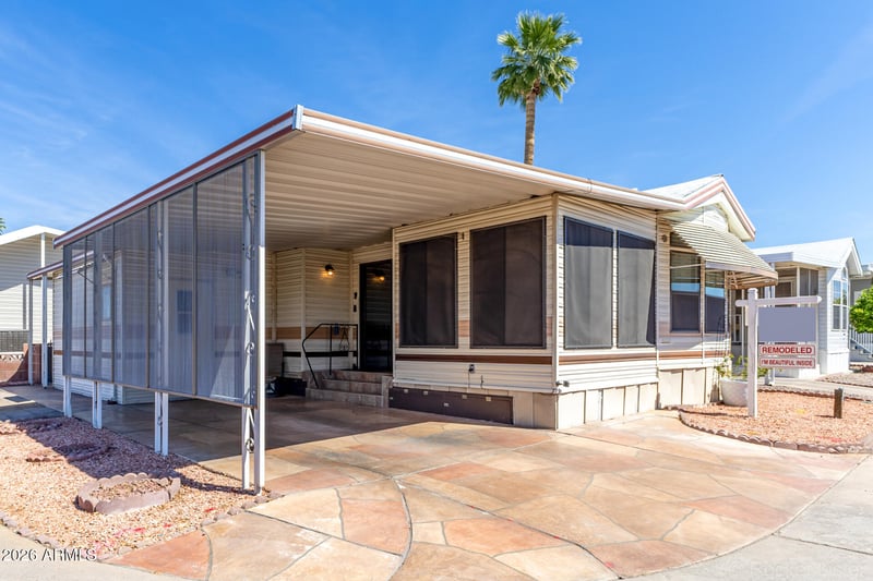 Listing details for 7750 Broadway Rd #736, Mesa, AZ 85208 : Welcome to this beautifully remodeled manufactured home on a desirable corner lot in the popular Carriage Manor Resort!! A covered carport with faux-flagstone flooring and a charming paver patio greet you on arrival. Inside vaulted ceilings, fresh neutral paint, and stylish LVP flooring create a bright and airy feel. The well-designed layout includes a living room, a fully equipped eat-in kitchen with generous storage, and a cozy family room. The bedroom features a mirrored closet, the pristine bathroom has a step-in shower, and the convenient laundry inside. Best of all, enjoy the vibrant 55+ resort lifestyle that Carriage Manor is known for: shuffleboard, pickle ball, bocce ball, tennis courts, a swimming pool, and a relaxing spa. This ONE is a must see.