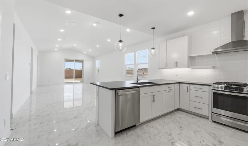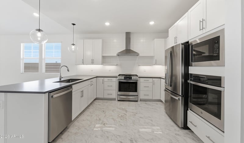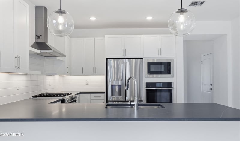 Listing details for 7779 Sands Rd, Glendale, AZ 85303 : ~Special CASH Pricing Available $479,990~ Discover modern living at Chalet at Legacy Place, a vibrant community offering a pool, playground, and BBQ ramada. This MOVE-IN READY Chawton plan home is thoughtfully designed with Farmhouse-inspired interior finishes. The open great room and dining area create an inviting space with easy access to the cover patio and fully landscaped backyard for indoor/outdoor living. The gourmet kitchen features crisp White cabinetry, Soapstone quartz countertops, and GE Profile stainless-steel appliances. A versatile home office is ideal for working from home, home gym, or retreat. The private primary suite boasts a spa-style bath with dual vanities, walk-in shower, and freestanding soaking tub. Three additional bedrooms complete this well-appointed home.