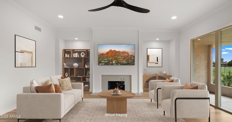 Listing details for 7801 San Carlos Rd, Scottsdale, AZ 85258 : You found it! This renovated home is light & bright with views of the lake, golf course & acres of green grass. NO STEPS IN THE HOME! A wall of windows and 10' ceilings in the great room lets the views in and access to the large south facing patio for entertaining. The kitchen and bathrooms are FULLY renovated with stainless Pro appliances and soft close solid wood cabinets. This home has 2 primary suites with ensuite bathrooms and walk in closets. The 3rd bedroom is a flex space Guest Room/Den/Office. The hall bathroom with rain head shower shares with the 3rd bedroom/flex space. NEW gas fireplace adds warmth and a cozy feel to the great room. Sandpiper is ideal for full time residents or a lock & leave lifestyle - 24/7 guard gated entry and secure package service. Come see it today!