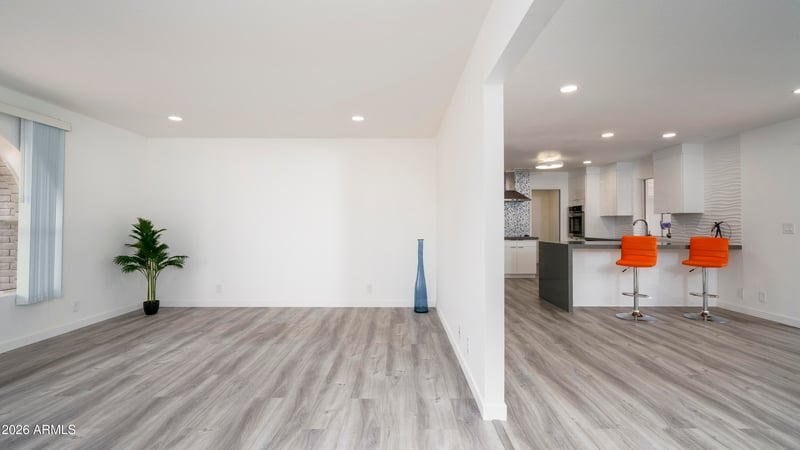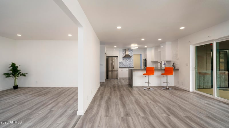 Listing details for 7803 Kiowa Ave, Mesa, AZ 85209 : FULLY REMODELED & MOVE-IN READY! Perfect for full-time living or beautiful retreat! Major updates completed, including an updated roof (2019), updated A/C (2019), fresh interior/exterior paint (2025)-giving peace of mind. Completely transformed in 2025 with new flooring, baseboards, recessed lighting, ceiling fans, hot/cold water supply lines. Stunning kitchen with quartz countertops, sleek European-style soft-close cabinets and drawers. Both bathrooms fully updated with new vanities, toilets, showers, flooring and fresh paint. Large south/southwest facing backyard toward golf course driving range, open peaceful setting, where you unwind watching Arizona sunsets. Additional highlights include spacious garage with built-in cabinets, dedicated golf cart storage area. Unpack and enjoy! The kitchen steals the spotlight with quartz countertops, sleek European-style soft-close drawers and cabinets.