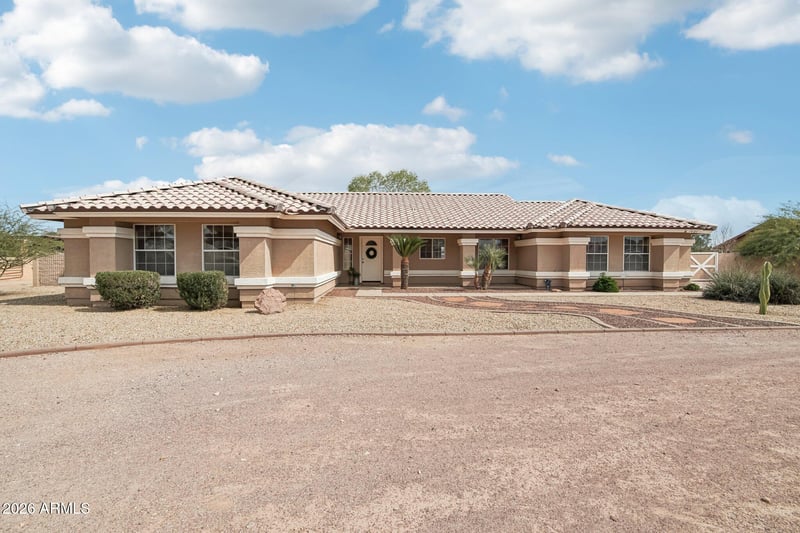 Listing details for 7821 173rd Ave, Waddell, AZ 85355 : Wake up to peaceful desert mornings & unwind with breathtaking sunsets over the White Tank Mountains at this exceptional 2-acre horse property with flood irrigation in the heart of Waddell-where every detail is intentional & designed for effortless country living. Equestrian amenities include a 1700sqft 4-stall barn, lit riding arena, fenced pasture, chicken coop, raised garden beds, & 6 mature citrus trees creating both beauty and abundance. The 4-bedroom, 2-bath home offers bright, welcoming living spaces, a well-appointed kitchen with ample cabinetry, & spacious primary suite. Relax or entertain under the covered patio, while the side-entry 2-car garage, circular driveway, & RV gate provide convenient access for trailers & toys-delivering the space & lifestyle you've been dreaming of.