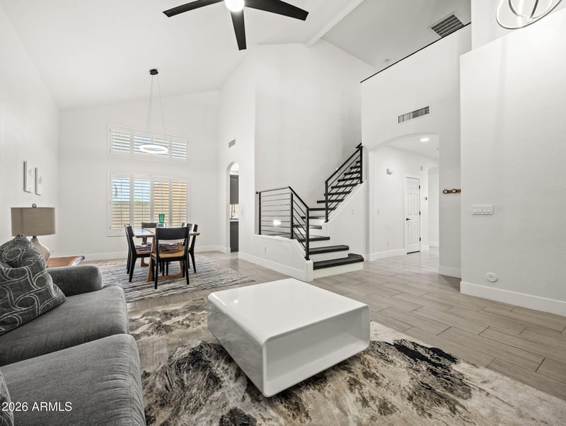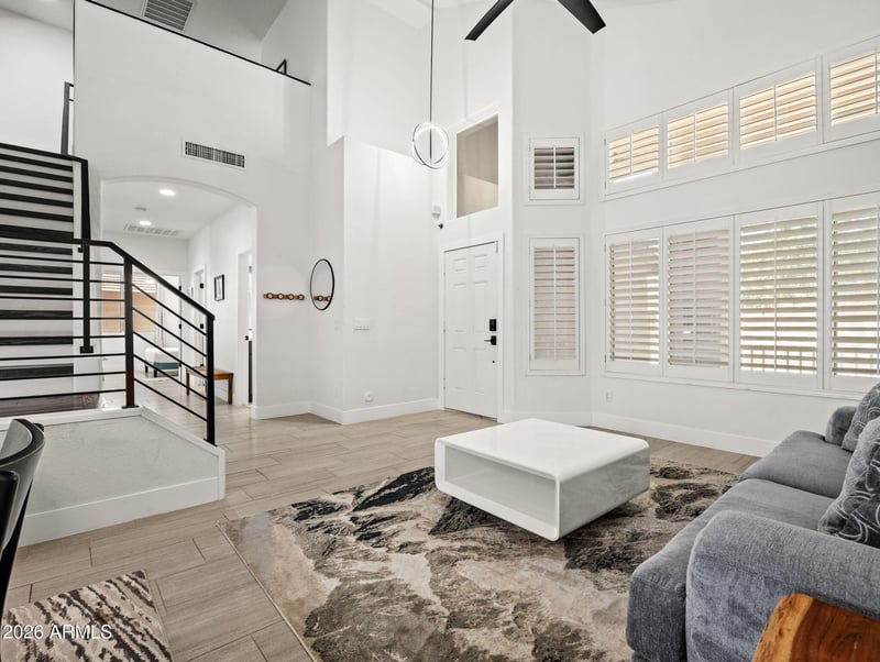 Listing details for 7821 Robin Ln, Peoria, AZ 85383 : Welcome to this highly updated home in the sought after Fletcher Heights community, offering a functional layout and high end finishes/fixtures including Kohler, American Standard, Delta, & skirted toilets for added cleanliness and modern touch. Inside, you'll find new tile and solid hardwood flooring throughout the entire home. The remodeled kitchen features dovetail, soft-close cabinets, quartz countertops, and newer stainless steel appliances. Downstairs features a guest bedroom and a fully renovated bathroom, ideal for visitors or flexible use. As you proceed upstairs along the custom modern stair railing you will find the primary bedroom with en-suite along with three additional bedrooms and one full guest bath. The fully updated primary bath includes new cabinets, quartz counters, an extended walk-in shower with multiple sprayers and a massive 100 gallon bathtub. Additional improvements include new window coverings, light fixtures, baseboards, and updated switches and outlets. Enjoy low energy bills with the paid off solar panels- $19k value. Major systems have been addressed with a brand new tankless water heater 2025 and replacement of both HVAC units 2022. The backyard offers a large covered patio, built-in grill, fire pit, and a pool--designed for everyday use and entertaining. 3 car garage featuring built in cabinets and epoxy floors. Can be sold furnished as well. Must see!