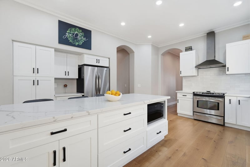Listing details for 7919 Posada Ave, Mesa, AZ 85212 : An incredible value for the East Valley. This meticulously remodeled single-level home offers a level of designer finish and energy efficiency rarely found at this price point. Nestled in the premium enclave of Boulder Creek and served by the highly-rated Gilbert Unified School District, this 4-bedroom residence has been reimagined for modern sophistication.