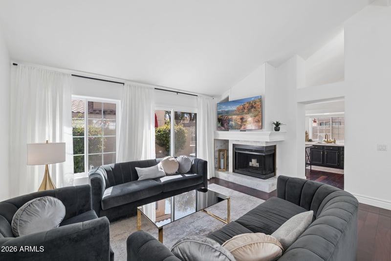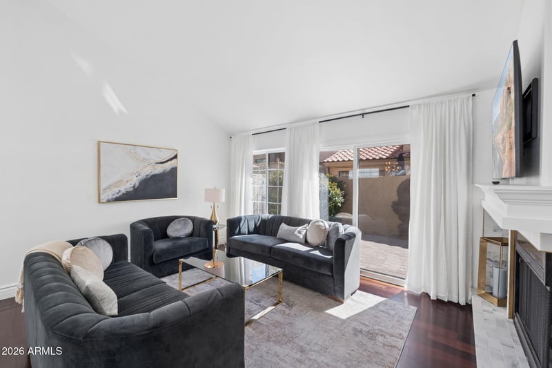 Listing details for 7925 Pepper Tree Ln, Scottsdale, AZ 85250 : May sell with Furniture please inquire! Stunning move-in ready La Jolla model townhouse in Camelview Greens! Largest single-level floor plan with 2 bedrooms, 2 baths, plus den/study (can be 3rd bedroom). Private end unit near the pool offers a quiet, secluded feel. Bright south-facing with vaulted ceilings, handcrafted wood-burning fireplace, and custom shelved closet in primary suite. Recent updates: A/C 2020, water heater 2020, refrigerator 2022, soft water system, outdoor pavers 2021. Just steps to Silverado Golf Course and walking/biking paths--a rare opportunity in a highly sought-after community!