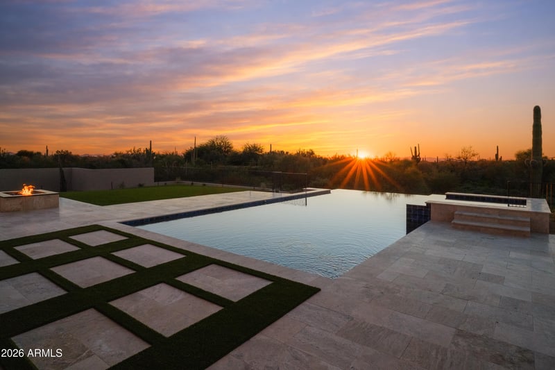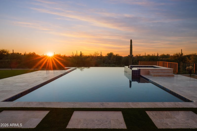 Listing details for 7926 Morning Vista Ln, Scottsdale, AZ 85266 : Exquisite new custom-built home on 2.17 acres showcasing refined architecture and superior craftsmanship. This thoughtfully designed home features a lush front courtyard leading to a stylish iron entry door. The chefs kitchen is stunning with custom cabinetry, luxury appliances, and elegant quartz counters. The spacious great room affords telescoping sliding doors leading to the resort style back yard with a heated negative edge pool and spa. The primary bedroom features a spa-inspired bath with floor to ceiling glass enclosed shower and generous closet space. All four additional bedrooms are en-suite, including an attached casita with secondary front entrance. Lots of toys?...The oversized and extended length 4 car garage with epoxy flooring will be perfect. No HOA and room to grow!
