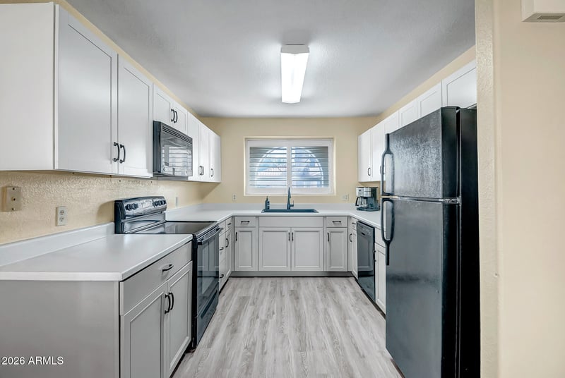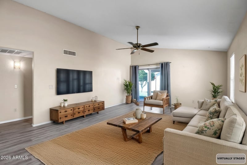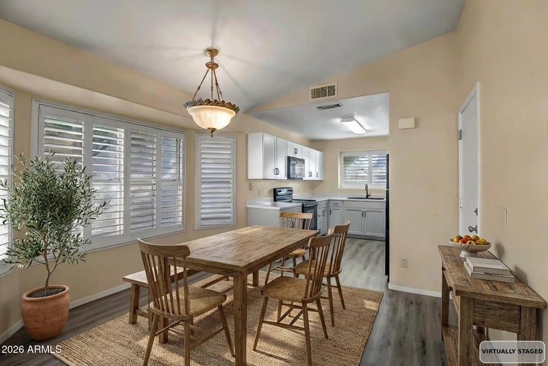 Listing details for 7950 Paradise Dr, Peoria, AZ 85345 : Adorable 2-Bedroom Gem You Don't Want to Miss! This cozy home in a great subdivision delivers way more space than you'd expect! Large rooms, and ceiling fans throughout keep everything feeling open and airy. The kitchen features white shaker cabinets, inlay sink, built-in microwave, and a sleek glass cooktop stove. Breakfast area right off the kitchen makes morning coffee feel civilized. New flooring in the kitchen, living room and primary suite makes for the complete fresh look and feel! The oversized great room gives you plenty of space to spread out, entertain, or just exist without feeling cramped. The primary bedroom surprises with TWO closets (finally, enough storage!) and a walk-in shower in the ensuite bath--simple, functional, and clean. The oversized 2 car garage and easy maintenance back yard are the perfect finish to this amazing home!