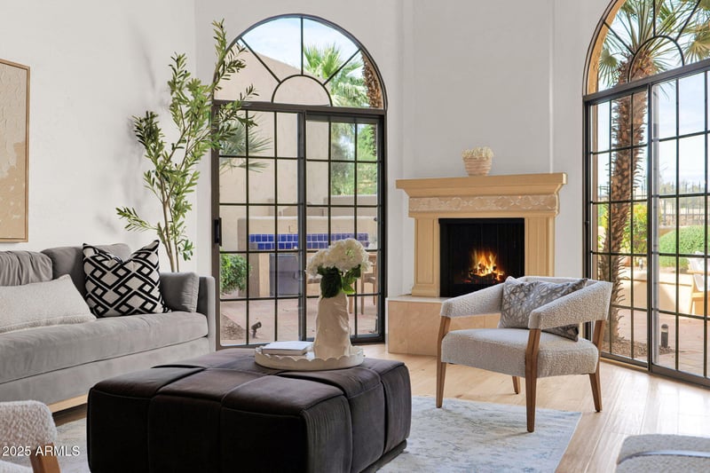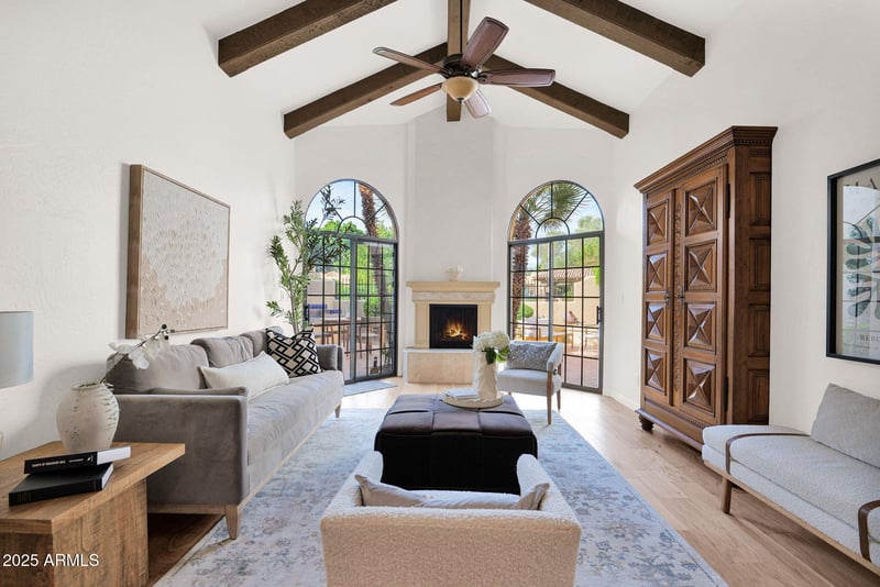 The Living Room makes a striking impression with vaulted ceilings accented by wood beams, an inviting fireplace, and dual sliding doors that fill the space with natural light enhanced by automated security metal sliders for added peace of mind.