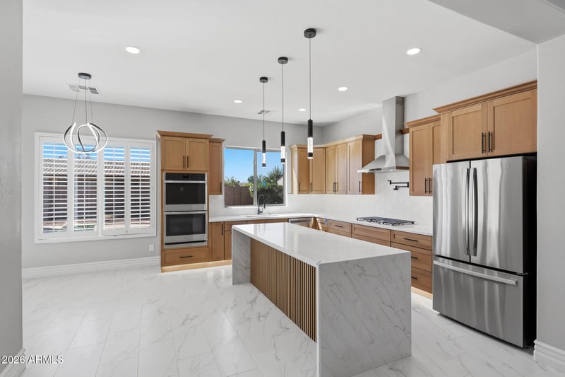 Listing details for 8001 San Juan Ave, Glendale, AZ 85303 : Welcome to Paradise in this completely renovated custom remodeled home inside and out!! New flooring, new cabinetry, new custom 6-inch baseboards and new painted throughout this beauty. This stunning home sits on 17,014 sq. ft lot & is already professionally landscaped in front & back! It's a very quiet neighborhood, consisting of 65 one-story homes in this attractive gated community located near Westgate & Cardinal's stadium! This one-of-a-kind unique home features 4 bedrooms plus a den with new custom, built-in bar with wine fridge. This home has freshly painted neutral colors, featuring formal living & dining room combo, new lighting fixtures and new fans in every room. The kitchen features beautiful brand-new oak cabinetry, custom lighting, new custom built 8-foot waterfall island