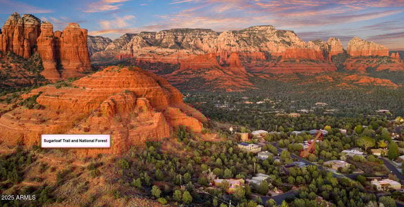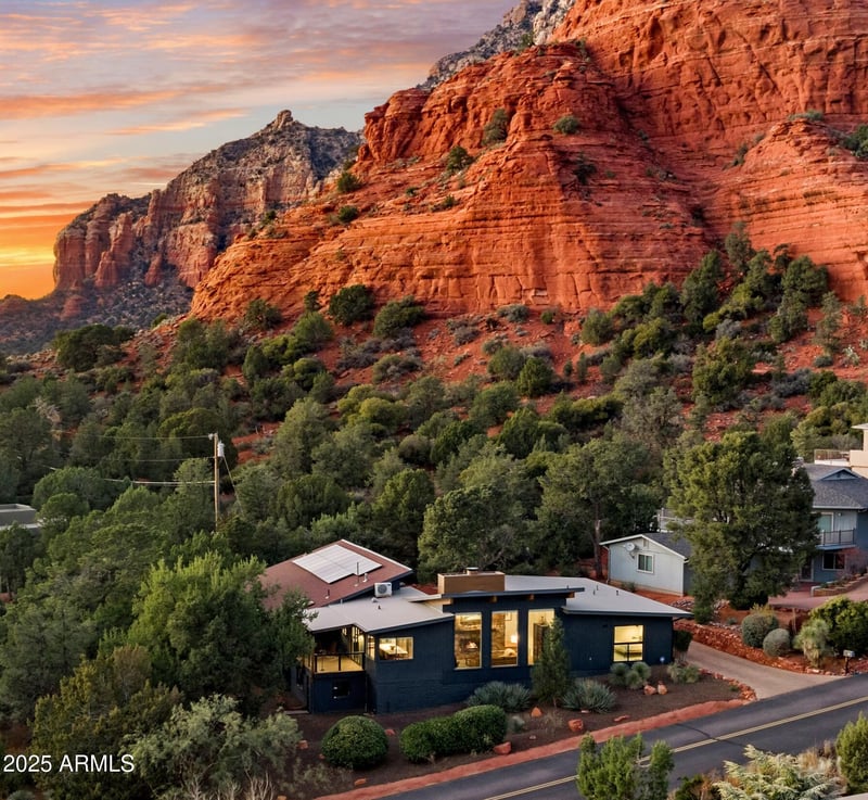 Listing details for 801 Mountain Shadows Dr, Sedona, AZ 86336 : This One Is a Keeper. This classic midcentury era timeless architecture updated unique and custom craftsman-inspired ''Blue Haven'' is perched on .39 acres, backing National Forest in the heart of West Sedona. Just step directly from your private trail and meander to the sugarloaf trail and experience privacy, views, and nature as part of everyday life. An extended and enlarged paver driveway and parking leads to the rear of the property—revealing what is actually the front courtyard and entry which has been reinvented with modern crisp lines making this a distinctive and welcoming approach. Let your heart abound, for inside you will find warm wood tones, walls of glass, and enduring architectural lines creating a setting that feels straight out of a design book, yet remains deeply inviting and livable, AND there is a view from almost every single window or door. The sunken living room is framed by 3 towering 10 foot windows offering those red rock views from every angle, vaulted wood beamed ceilings, and an epic floor to ceiling stone wood-burning fireplace serving as the focal point, with in-laid subtle crystalline sparkle quartz stone and sandstone in soft hues of cream, blush, and warm earth which creates a rich tapestry of texture and tone, making it a architectural centerpiece. Redesigned chef's kitchen is a true delight, completely remodeled with quality and intention boasting marble and quartz countertops, custom cabinetry, an added center sitted island, double refrigerator, range, hood, dishwasher, and microwave combines beauty with functionality and topped with tongue and groove pine ceiling with exposed wood beams. Breathtakingly beautiful. The kitchen and dining area flow effortlessly through accordion sliding doors to a new large covered deck with cable railings, creating seamless indoor-outdoor living and the perfect setting to entertain while taking in awe-inspiring Sedona views. The primary bedroom bath has been reinvented to feature a luxurious walk-in shower, modern cabinet with vessel sink, and dual walk-in closets and an added enlarge window to take in the views that greet you each morning. Bedrooms two and three enjoy close-up views of Sugarloaf Mountain and are connected by double doors ideal for two separate bedrooms or open to create a larger, flexible space. A former media/family room has been transformed into a fully functioning fourth bedroom/bonus room with views, complete with double closets, a bonus three-quarter spa bath and accordion Eris sliding doors that fully open to let nature inside and offers exceptional flexibility for guests, multigenerational living, or as a home office. I love the clerestory windows in this room! Additional features include an insulated and dry walled two-car garage, lower-level storage room, lower level garden level potting studio with utility sink, and multiple outdoor areas with room for gardens, additional parking, or even a pool. Let your imagination soar! Pleny of parking for guests, and side yard has plenty of parking for an RV too! Some of the vast list of home improvements include, new roof with European gutters, hall guest bathroom remodeled, cedar lined hall closets, barn doors and solid interior doors and white oak hardwood flooring added, chic light fixtures, reverse osmosis water purification system, new water softener, new washer/dryer in 25, retextured and repainted interior walls and full exterior repaint, added additional paved parking spaces and flagstone patio. 19 owned solar panels and fully loaded ADT security system for peace of mind and low utility bill. Furniture and household items are available under a separate sale bill, making this unique, custom, mid-century modern Sedona gem truly move-in ready. 801 Mountain Shadows, in the shadow of Sugar loaf mountain is full of grace, distinction, and chic class with enduring style and lasting appeal. A refuge in today's world. Let your heart abound. You have found your home.
