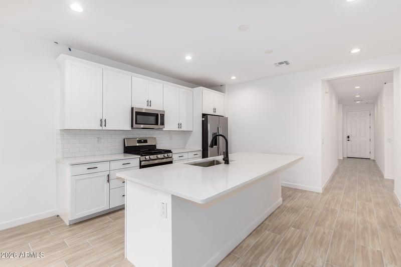 Listing details for 8018 Granada Rd, Phoenix, AZ 85035 : Welcome home to this beautifully upgraded single-story residence offering 5 bedrooms and 3 full baths in a thoughtfully designed open-concept layout. Step inside to discover designer finishes throughout, including elegant 9'' x 35'' tile flooring in all main living areas and carpet only in the bedrooms for added comfort. The spacious kitchen showcases stainless-steel appliances, gas cooking connections, a large center island, and a walk-in pantry, flowing seamlessly into the open dining and great room that overlook the covered patio, perfect for entertaining or relaxing. The private primary suite features a spa-inspired bath with dual sinks, a walk-in shower, and a generous walk-in closet. At front of home are 2 Bedrooms that share bathroom and centrally located in the home are 2 other bedrooms and a bathroom, ideal setup for guests or multi-generational living. Additional features include paver driveways, a tankless water heater, and a two-car garage. Located within a gated community offering a splash pad and recreational spaces, and just minutes from convenient I-10 freeway access, this home delivers both comfort and connectivity. Experience the perfect balance of modern design, premium finishes, and community lifestyleall in one exceptional single-story plan.
