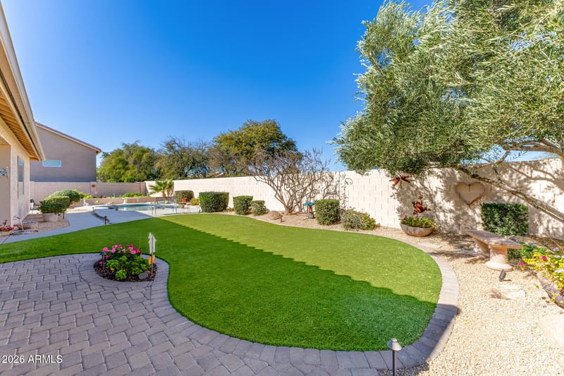 Listing details for 8022 Donald Dr, Peoria, AZ 85383 : Immaculate home on oversized lot in Deer Valley Estates showcases mature desert landscaping, large driveway, extended-length 3-car garage. Gated, paved courtyard leads to a semi-open floor plan with high ceilings, plantation shutters & wood-like flooring. Front sitting room adjacent to home office. Bright, open great room centers around a cozy fireplace, huge kitchen island, double ovens, recessed lighting, white cabinetry, granite counters. Spacious, private primary suite features plush carpet, private backyard access, ensuite bathroom with dual vanity, separate tub & shower & walk-in closet. North-facing backyard is a dream with a covered paved patio, low-maintenance synthetic turf, sparkling pool & raised garden bed. New pool pump, A/C units, Security door, Roof. See Docs Tab 4 more.