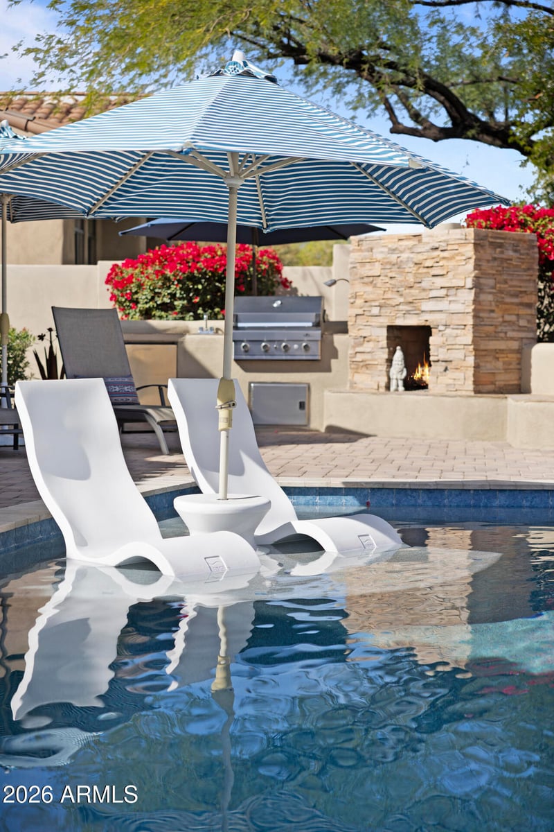 Listing details for 8084 Windwood Ln, Scottsdale, AZ 85255 : Welcome to an elevated desert oasis in Grayhawk, located behind the guard gates of Raptor Retreat in North Scottsdale. This beautifully remodeled home offers a true indoor-outdoor lifestyle with a desirable north-facing backyard, resort-style pool and spa, and seamless open-concept living. Inside, the home showcases a thoughtfully designed open floor plan filled with natural light and refined, contemporary finishes. The fully remodeled chef's kitchen is the centerpiece, featuring sleek quartz countertops, custom shaker cabinetry with glass accents, designer pendant lighting, and a farmhouse sink. Premium Thermador stainless steel appliances, including a highly sought-after induction cooktop, elevate both function and design. A large center island with bar seating creates the perfect... space for entertaining and everyday living. The kitchen opens effortlessly to the dining area and great room, creating a spacious and connected living environment ideal for hosting. Step outside to your private resort-style backyard, complete with a sparkling pool, cascading water feature, raised spa, and Baja shelf for in-water lounging. The expansive covered patio, built-in BBQ, and outdoor fireplace create multiple spaces for entertaining and relaxing year-round. Mature desert landscaping and ambient lighting enhance the privacy and ambiance of the home, while a charming front courtyard offers an additional outdoor living space perfect for morning coffee or intimate gatherings. Located in a guard-gated community in Grayhawk, residents enjoy access to championship golf courses, scenic walking trails, upscale dining, and top-rated schools. This home offers a rare combination of privacy, security, and lock-and-leave convenience in one of North Scottsdale's most sought-after neighborhoods.