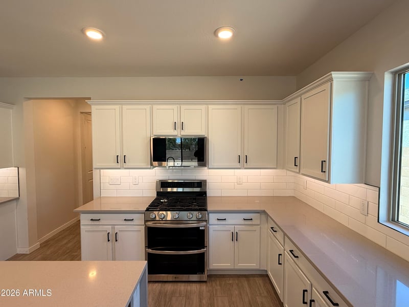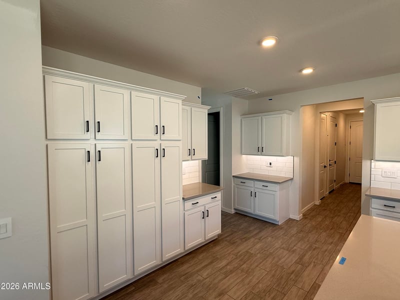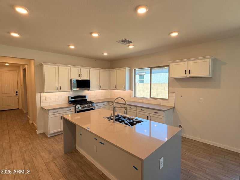 Listing details for 8219 173rd Ln, Waddell, AZ 85355 : Single Story, 2-Car Garage, 3 BR, 3 Bath, 36'' Derby White Cabinets, Soft Close Door and Drawers, Simply Grey Quartz Countertops, Waterfall Edge Island, Under Cabinet LED Kitchen Lighting, Glen Arbor Gray 6 x26 Wood Looking Tile, Carpet at Bedrooms Desert Flower, Faded Grey Interior Paint, SS Gas Range Double Oven Slide-In Appliance Package, Holiday Pkg, Laundry Room Cabinets with Sink, Soft Water Pre-Plumb, Gas Stub for future BBQ, Black Hardware, Subway White 4x16 Kitchen backsplash,