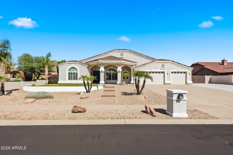 Listing details for 8240 Villa Lindo Dr, Peoria, AZ 85383 : Immaculate custom-built home in Calle Lejos Estates! This 4 bed/3.5 bath single-level residence offers a spacious open floor plan with abundant natural light, perfect for everyday living and entertaining. The modern open kitchen features top-of-the-line stainless steel appliances, exquisite cabinetry, sleek countertops, and an island with breakfast seating. The master suite provides a serene retreat with a luxurious bathroom, expansive walk-in closet, separate sitting area, and private entrance to the resort-style backyard. Stay cool in the sparkling pool or under the covered patio, or soak up the Arizona sunshine throughout the vast property. Situated close to great Peoria schools, parks, and dining, this home combines convenience and comfort in one desirable location. Welcome home!