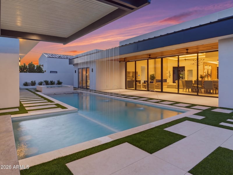 Designed for ultimate comfort and entertainment, the home features a private movie theatre, integrated Sonos sound system with individual controls, and a 7-camera security system monitored via iPad. Energy-efficient features include dual insulated construction, high SEER HVAC systems, reflective-coated roof, tankless water heater, water softener, and whole-home water filtration system. Top of the line electric curtain rod in the living room and the primary bedroom. A beautifully appointed spacious 1-bedroom guest house offers a full kitchen and living area. The primary suite is a luxurious retreat with fireplace, spa-inspired bath, smart features, and a custom walk-in closet. This flawless modern estate is ideally located near Camelback and Hayden, moments from premier dining, shopping, and entertainment.