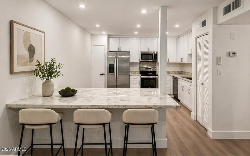 Listing details for 830 Dobson Rd #72, Mesa, AZ 85202 : Completely renovated & move-in ready, this beautiful townhome in Sky View Mesa offers modern, low-maintenance living with 2 bedrooms, 1 bathroom, & two assigned parking spaces. The bright, open interior features new vinyl windows & a sliding glass door, luxury waterproof laminate flooring, recessed LED lighting, & updated electrical throughout. The redesigned kitchen showcases white shaker cabinets, granite countertops, & brand-new high-end GE & Bosch stainless steel appliances. The fully remodeled bathroom includes stylish tile, a new tub & shower enclosure, a modern vanity, updated fixtures, and LED lighting. You'll love the spacious bedrooms. Enjoy your morning brew under the cozy covered patio. Residents also enjoy access to the community pool, making this turn-key home a must-see!
