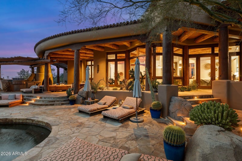 Listing details for 8300 Dixileta Dr #263, Scottsdale, AZ 85266 : This beautifully decorated and thoughtfully remodeled organic Pueblo style estate is a must see in person, with incredible views that truly have to be experienced to be believed. Set high on Lone Mountain in the guard gated community of Sincuidados, the property spans 3.4 acres across double lots, with an additional adjacent acre offering the possibility for the future expansion. Perched on an exceptional view lot, the home captures magnificent mountain and city light views from virtually every room, delivering extraordinary privacy while still enjoying the benefits of an active neighborhood. Designed by award winning architect and Master of the Southwest Lee Hutchison, the residence showcases authentic Southwestern design with real hickory wood floors, polished concrete accents, substantial viga beams, and hand laid adobe brick walls. Handcrafted windows and screens and eight real gas fireplaces add warmth, character, and timeless appeal throughout. The spacious great room flows seamlessly into a gourmet kitchen featuring a Viking Professional 6 burner range, 24K gold farm sink, and hand painted tile accents. An elevator provides convenient access from the oversized four car garage, complete with new epoxy flooring, built in cabinetry, and a large storage room, directly to the main family room and kitchen level. The primary suite serves as a private retreat with a gas fireplace and spa like bath showcasing a jacuzzi soaking tub perfectly positioned to take in the mountain views, along with a custom steam shower. A detached casita offers its own private escape with sweeping city light views.Outdoors, a heated infinity edge pool with dark pebble finish and jetted spa appear to spill into the surrounding desert and distant mountains. Multiple covered flagstone patios and an outdoor kitchen with a Viking BBQ create ideal spaces for entertaining against a backdrop of dramatic desert scenery. The cost to replicate this home today, along with its magnificent lots, represents an extraordinary opportunity to own a true view estate in one of North Scottsdale's most vibrant guard gated communities. Beautifully remodeled and impeccably maintained, this is a rare offering combining expansive acreage, unmatched privacy, and incredible views that must be seen in person to fully appreciate, with the added potential to expand on the additional lot with a new garage, guest house, or private pickleball court.