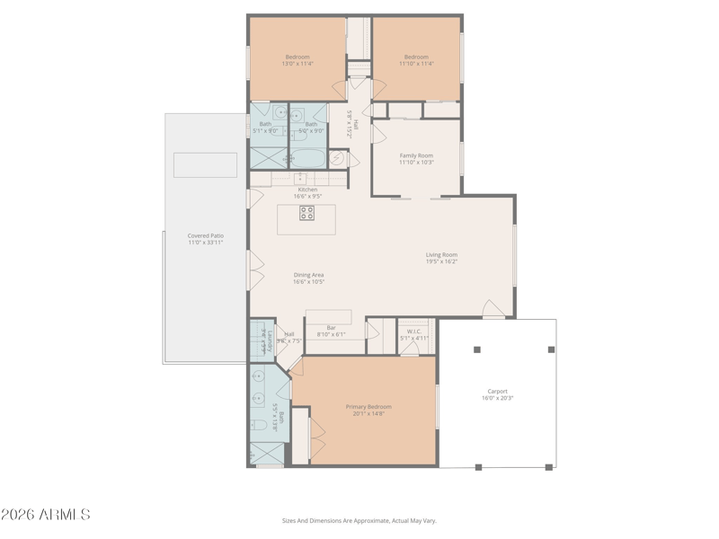 This updated 4-bedroom, 3-bathroom home offers 1,936 square feet of living space on a 6,651-square-foot lot in one of Scottsdale's most convenient locations. The open-concept layout connects the living room, kitchen, and dining area into one bright, airy space filled with natural light. Wood-look tile flooring runs throughout, while the kitchen features brand-new quartz countertops, a large center island with seating for four, a new sink and refrigerator, and a spacious walk-in pantry. A charming bar area adds character, and the dining space sits just off the backyard, creating a seamless indoor-outdoor flow. The split floor plan places the primary suite on one side of the home and three additional bedrooms on the other. The primary suite includes 2 closets, one of which is a walk-in, both with custom built-ins. The primary bathroom features dual sinks, a walk-in shower, generous storage, and great natural light. One secondary bedroom has its own en-suite bathroom with a remodeled walk-in shower, while the additional guest bathroom offers a tub/shower combination with counter space and cabinetry below.