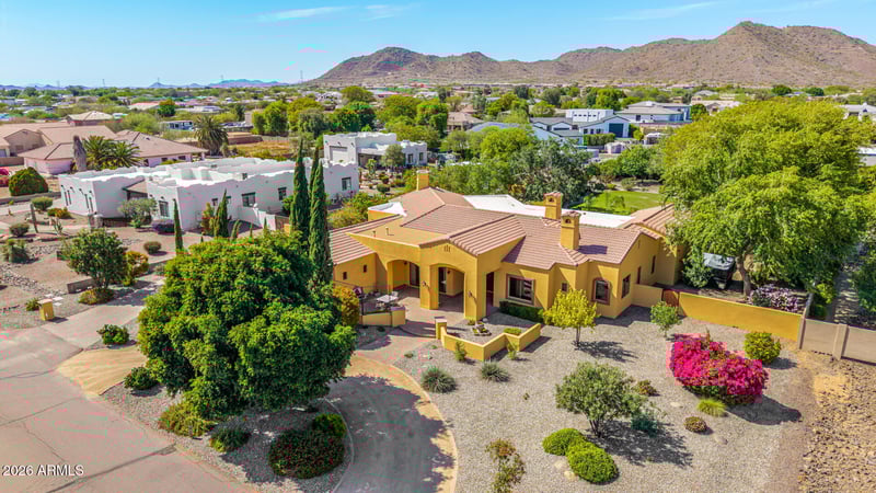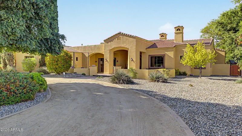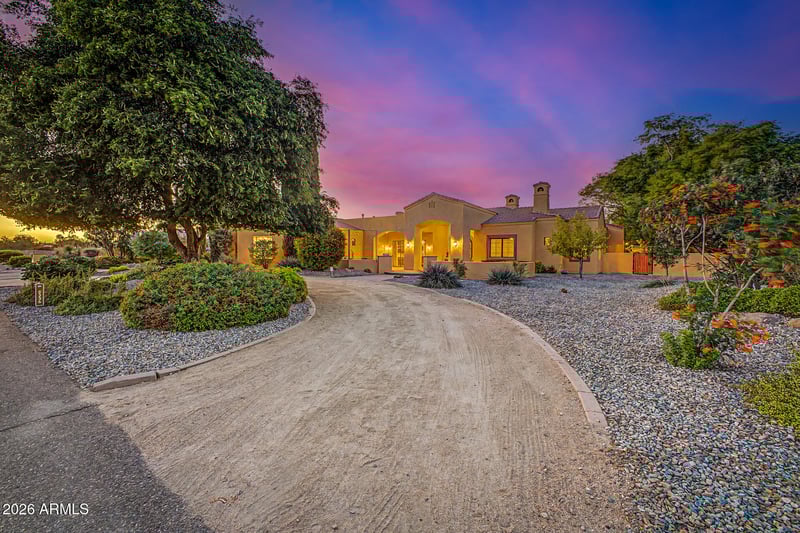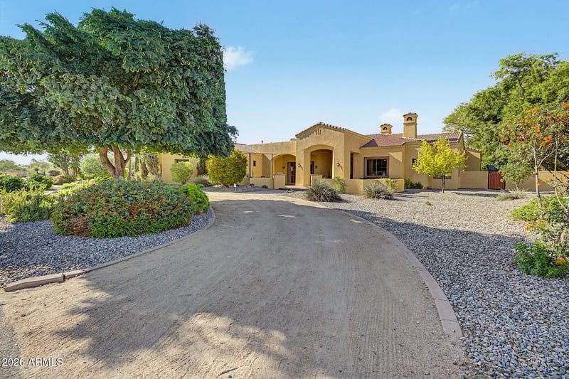 Listing details for 8336 Avenida Del Sol --, Peoria, AZ 85383 : Stunning custom Tuscan estate in North Peoria on over an acre with NO HOA, walkout basement, resort-style pool, putting green, and 900 sq ft shop. This 5,030 sq ft home offers 4 bedrooms, 3.5 baths, with seamless indoor & outdoor living designed for the Arizona lifestyle. From the moment you arrive, the circular driveway, lush mature landscaping, and private courtyard with dual fountains create a grand first impression. Inside, a dramatic foyer framed by solid concrete faux marble pillars draws your eye through the formal living space to the breathtaking backyard beyond. Walls of glass showcase a true outdoor retreat--complete with a custom pool & rock waterfall, expansive covered patio, outdoor fireplace, gazebo, and private putting green. Designed for both everyday living & entertaining, including whole-house sound system. The home effortlessly blends indoor & outdoor spaces. Four grand fireplaces anchor the home's living spaces--featured in the formal living room, family room, primary suite sitting area, and backyard--adding warmth, scale, and architectural presence throughout. The gourmet kitchen features custom alder cabinetry, granite countertops, a large island with prep sink & built-in steamer, 6-burner gas cooktop, high-end Advantium and Trivection ovens, a warming drawer, and a custom walk-in pantry. It opens to the main living area, dining space, and a functional family connection station, all adjacent to a spacious laundry/utility room. The primary suite offers a sitting room with fireplace & patio access, along with a spa-inspired bathroom featuring dual vanities, two custom walk-in closets, Bain Ultra air-jet soaking tub, and dual-entry walk-in shower with tankless water heater. A secondary bedroom & full bath are also located on this wing. The fully finished walkout basement adds exceptional versatility with a large media room, custom built-ins, two bedrooms with large walk-in closets, full bath, storage, and private patio with direct backyard access. Additional highlights include a 900 sq ft shop with custom-built-in shelves, RV gate, whole-home water softener & RO system, travertine flooring, custom doors and cabinets throughout. A rare opportunity to own a private, resort-style estate in one of Peoria's most desirable areas.