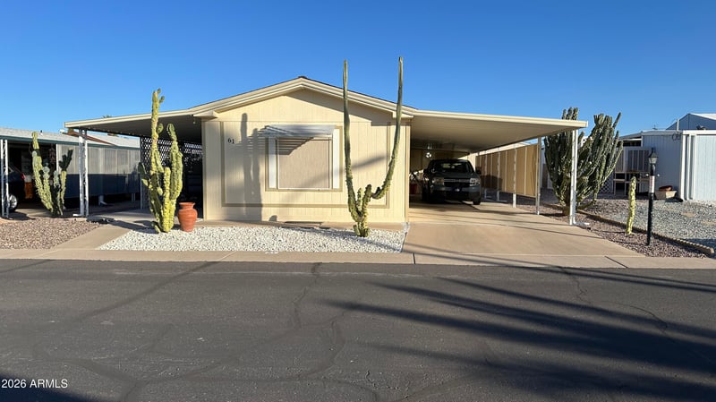 Listing details for 834 Meridian Rd #61, Apache Junction, AZ 85120 : You will be ready to say yes to this address! New A/c system, countertops and bedroom flooring With 1120 sq ft you will be ready to entertain inside and out. The covered patio has lot of room to be outside and shaded also! The primary bedroom with primary bath and walk in closet is an oasis of privacy. There is a great workshop all set up also to work on all those projects you have planned! 55 + community gives you peace and quiet also when you want it! Community is active so you have so many chances to meet new friends at the pool or in the rec center!