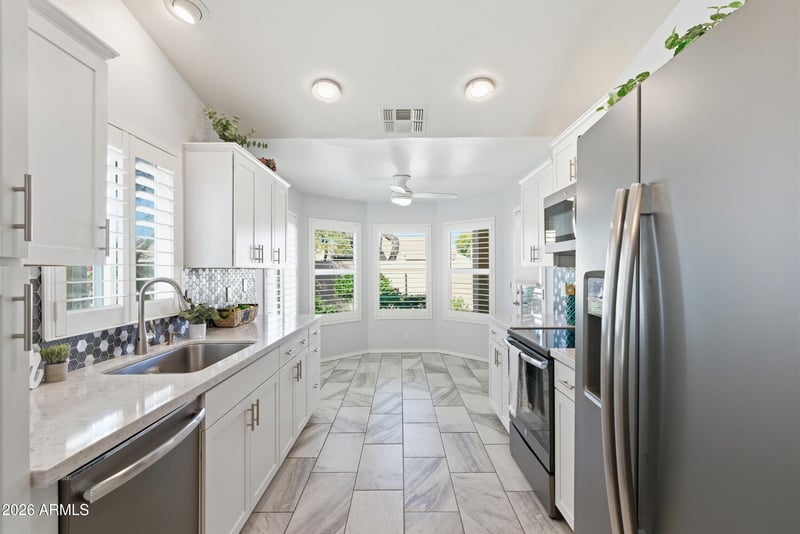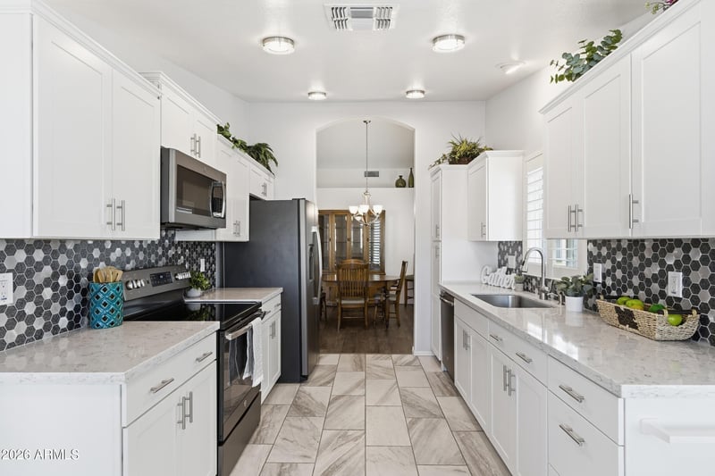 Listing details for 8340 Taro Ln, Peoria, AZ 85382 : WELCOME to this LOVINGLY MAINTAINED and BEAUTIFULLY APPOINTED home in the DESIRABLE Westbrook Village*You will have SOARING CEILINGS and ABUNDANT NATURAL LIGHT from the NEWLY INSTALLED WINDOWS (2025)*NEWER ROOF (2018) offers PEACE of MIND*Your UPDATED KITCHEN has QUARTZ COUNTERS, newer WHITE SHAKER CABINETS, pull out shelves, 12X24 TILE, and SLEEK SLATE APPLIANCES (dishwasher new in 2026)*SHUTTERS*FORMAL DINING can be FLEX SPACE if wanted for an OFFICE*GREAT ROOM has VAULTED CEILINGS*Owner SUITE is split and has walk-in closet and comfort heigh TOTO toilet, large vanity with two sinks, and walk-in SHOWER at bathroom* EPOXY floors at TWO-CAR garage*INSIDE LAUNDRY with CABINETS*BACK YARD has a COVERED PATIO and nice use of PAVERS*COME BY and see why YOU WILL WANT TO CALL THIS PLACE ''HOME''