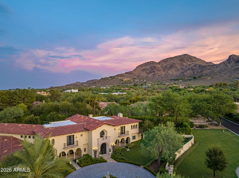 Listing details for 8353 58th Pl, Paradise Valley, AZ 85253 : This unique 8,768 sq ft property is on a tranquil cul-de-sac, adjacent to expansive 5-acre estates. The lush grounds w/ multiple covered patios, very high hedges for ultimate privacy, a huge lawn + beautiful flowering pots are an oasis of tranquility. The exquisite PARISIAN INTERIOR with Fabulous French handmade wallpaper, drapes, lace curtains, mahogany wood floors + marble checkered floors guide you through this home. The home captivates with its unique architectural details, some examples include the hand painted/stamped panels of wallpaper, imported from Zuber in Europe, as well as the venetian plaster in the downstairs guest bedroom which was achieved by pinning lace to the wall, plastering over it, and then removing the lace, leaving behind an imprint of the lace detailing... Entertain in style w/ a pub-like built in bar + attached large stone wine rm seating 8. The chef's French country kitchen boasts a breakfast nook, a dining cove and charming Toile de Jouy details. The adjoining family rm has deep mahogany walls and ceilings and an inviting library loft with fleur-de-lis stained glass windows which add a touch of light + beauty. This 5 bedroom property with an exquisite primary suite also has a paneled library + theater. It is a harmonious blend of elegance, functionality, and French design!