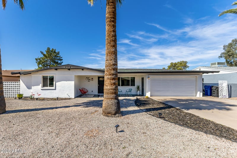 Listing details for 836 Saranac Ave, Mesa, AZ 85208 : MUST SEE BACKYARD OASIS! This STUNNING mid century home has all the luxuries you are looking for! Step inside to beautiful updates including stylish, maintenance free concrete floors, tons of natural light, and neutral colors that work great with any choice of decor. The galley-style kitchen features recessed lighting, shaker cabinets, quartz countertops, and built-in appliances for a seamless cooking experience. Extra large primary bedroom with en-suite features dual sinks! This back yard is AMAZING! Get ready for weekend grills and peaceful evenings in the absolutely beautiful landscaped backyard, complete with a covered patio, serene ponds, even a small chlorinated pool for dipping in, artificial grass, and fantastic golf course views and incredible sunsets. Upgrades and Features in this mid-century modern home include: