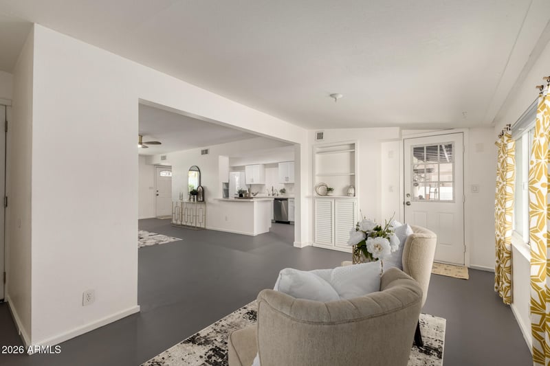 Listing details for 836 Saranac Ave, Mesa, AZ 85208 : NEWLY RENOVATED IN MARCH! MUST SEE BACKYARD OASIS! This STUNNING mid century home has all the luxuries you are looking for! Step inside to beautiful updates including stylish, maintenance free concrete floors, tons of natural light, and neutral colors that work great with any choice of decor. The galley-style kitchen features recessed lighting, shaker cabinets, quartz countertops, and built-in appliances for a seamless cooking experience. Extra large primary bedroom with en-suite features dual sinks! This back yard is AMAZING! Get ready for weekend grills and peaceful evenings in the absolutely beautiful landscaped backyard, complete with a covered patio, serene ponds, even a small chlorinated pool for dipping in, artificial grass, and fantastic golf course views and incredible sunsets. Upgrades and Features in this mid-century modern home include: