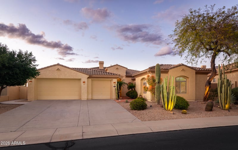 Listing details for 8388 Twisted Leaf Dr, Gold Canyon, AZ 85118 : Panoramic Superstition Mountain views and stunning sunsets define this exceptional single level home with a true resort-style backyard. Enjoy a heated pool, in-ground spa with gas fire pit, dramatic beehive gas fireplace with seating, synthetic grass, fruit trees, and an electric screened covered patio. Entertain effortlessly with a built-in BBQ and mini fridge just off the kitchen. Inside, the open and split floorplan offers ideal separation for guests, while the expansive great room with gas fireplace showcases views from the primary suite, dining area, and kitchen. Four doors open seamlessly to the outdoor oasis. New 50-year warranty roof and newer Trane HVAC systems provide peace of mind. Spacious 3-car garage with cabinets, workbench, and temperature controlled. Furnishings available.