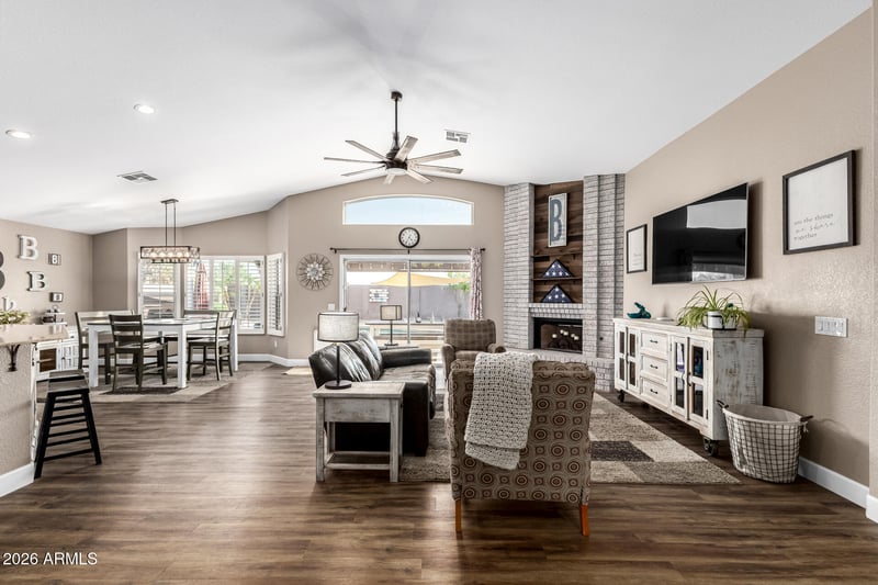 Listing details for 8401 Cherry Hills Dr, Peoria, AZ 85345 : Stunning updated 3-bedroom, 2-bath home in sought-after Bridlewood. From the soaring ceilings and neutral palette to the plantation shutters and designer touches, this home is move-in ready. The open kitchen is beautifully appointed with stainless steel appliances, custom cabinetry, tile backsplash, pantry, stone countertops, and a large center island with raised breakfast bar. Generously sized bedrooms offer plush carpeting and abundant natural light. The spacious primary suite features a walk-in closet, dual vanities, and an impressive updated walk-in shower. The resort-style backyard is complete with a sparkling pool and no rear neighbors, offering exceptional privacy--perfect for relaxing or entertaining. A true must-see.