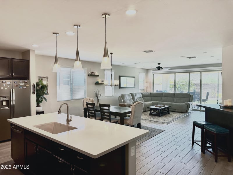 Pride of ownership shows in this freshly painted, highly upgraded single-level home, built in 2020 and truly move-in ready. Step into a bright, open great room with a three-panel slider framing your private backyard, long range views of Estrella Mountain Regional Park, and starry night skies. This 3 bedroom, 2 bath home offers a split floor plan plus a flex room for an office, workout studio, or den. Beautiful quartz counters throughout, including your gourmet kitchen with a large island, gas range, smart appliances, and a huge walk-in pantry. Prime location at Estrella's first entrance with quick access down the hill for shopping, dining, sporting events, concerts, casinos, and more! Discover why Estrella is the West Valley's best kept secret! Live the resort lifestyle with access to Estrella's 2 clubhouses, 3 pools, 2 fitness centers, Estrella Yacht Club, 2 lakes, pickleball, basketball, volleyball, bbq's, community clubs and events, plus so much more. This one is a must-see! Owner is a AZ licensed real estate agent.