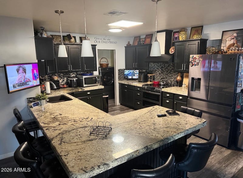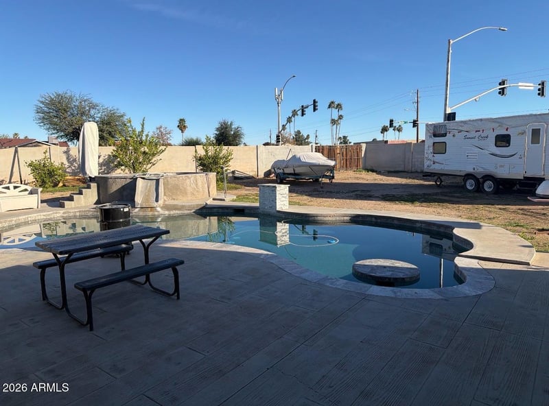 The fully remodeled kitchen (2015) features granite countertops and is ideal for entertaining and everyday living. The property includes both front and rear RV gates, RV power hookup, and ample parking—perfect for RVs, trailers, or toys. Enjoy Arizona living with a resurfaced pool (2022), mature landscaping, and a convenient poolside shower and bathroom. The large covered patio is equipped with a swamp cooler, creating a comfortable outdoor space for year-round enjoyment.