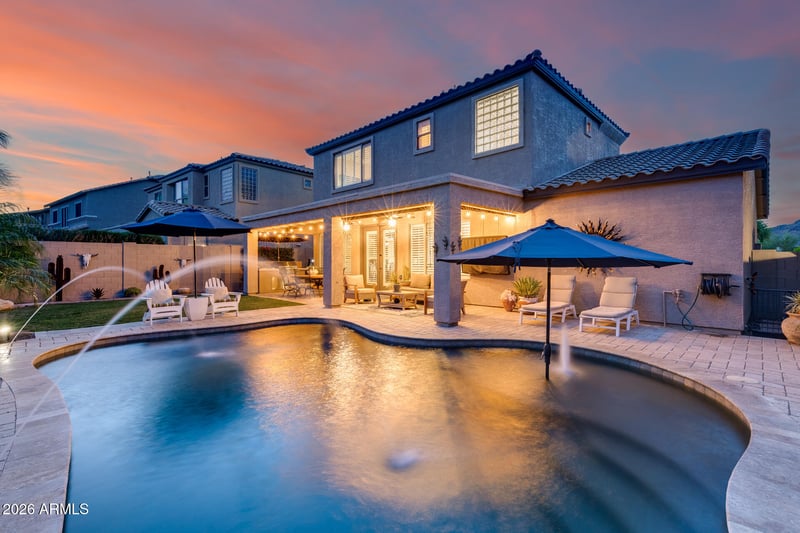 Listing details for 8479 Coyote Dr, Peoria, AZ 85383 : Spacious Living in an Unbeatable WestWing Location! This stunning 2,211 SF home offers 3 bedrooms and 2.5 baths with a bright, open layout, soaring ceilings, neutral tones, and brand-new plantation shutters throughout. The kitchen features granite countertops, an undermount sink, staggered cabinetry, a breakfast bar, and pantry. It opens to the dining area and cozy family room with a gas fireplace and backyard views, perfect for everyday living and entertaining. Upstairs includes generously sized bedrooms, a versatile loft, and mountain views from every room. The spacious primary suite offers a walk-in closet, dual sinks, soaking tub, and separate shower. Step outside to your private desert oasis with a heated pool, view fencing, and a large covered patio with ceiling fans and a built-in BBQ, ideal for Arizona evenings. Additional highlights include a 3-car garage and a large lot in the sought-after WestWing community, near top-rated schools, parks, and hiking trails.