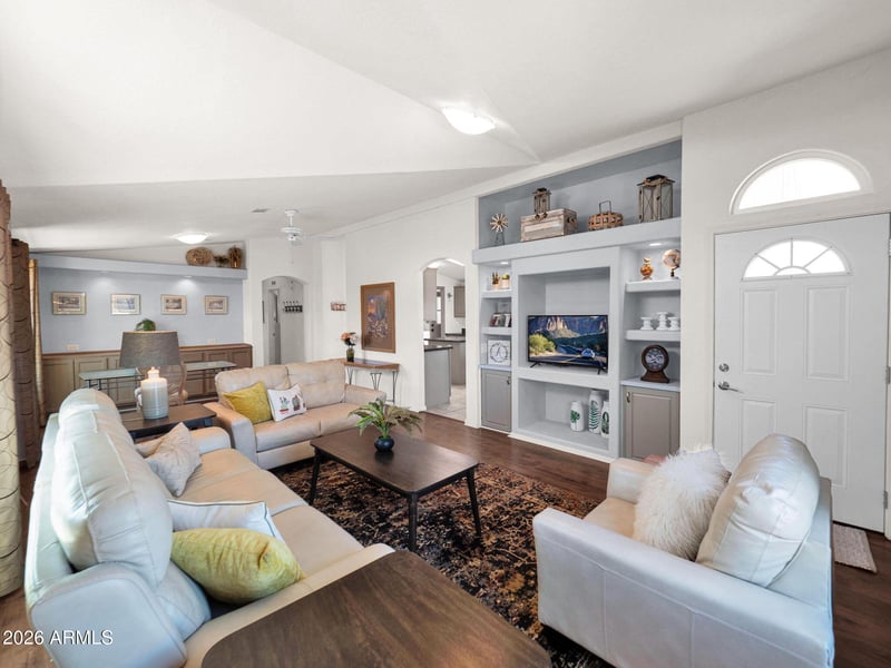 Listing details for 8500 Southern Ave #413, Mesa, AZ 85209 : Beautifully updated and FULLY FURNISHED 2-bedroom, 2-bath home featuring souring vaulted ceilings, a spacious open-concept layout and an oversized primary suite. The large kitchen and dining area boast all-NEW appliances, updated countertops, and freshly painted cabinets. Enjoy abundant natural light through brand-new windows with updated blinds throughout. The expansive family room flows seamlessly into the dining space, creating an ideal setting for entertaining. Additional highlights include a built-in buffet with ample storage, a NEW HVAC unit, and a versatile, oversized storage shed--perfect for a workshop, hobby space, or additional storage. A rare cinder block wall provides enhanced privacy, completing this exceptional home.